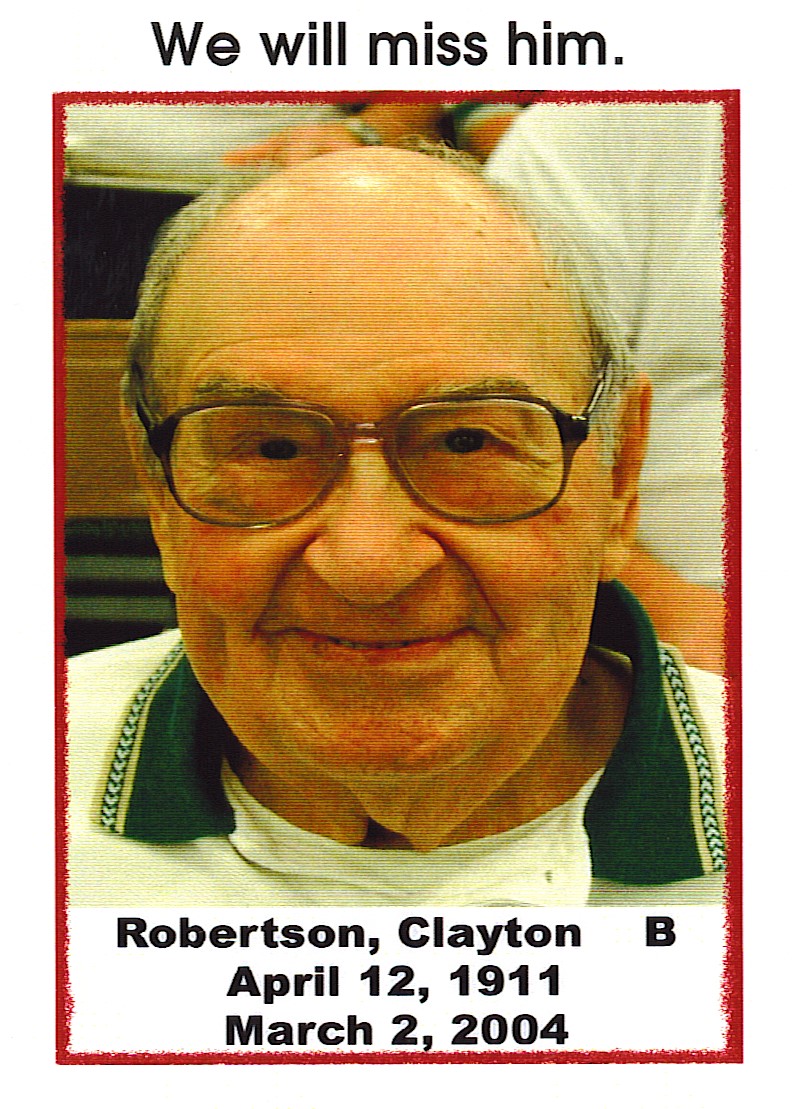 April 12, 1911 March 2, 2004. The Heavenly Choir has a new bass singer today! Clayton is home with the Lord. He was born April 12, 1911, on a farm near Mediapolis, Iowa, to the late John and Lena Mabel Robertson — the 7 th of 10 children. He died March 2, 2004, in McAllen. He was active in the church choir of St. Mark United Methodist Church in McAllen, Texas, for 34 years. He was also a founding member of the barber shop harmony group known as the Magic Valley Men of A Chord, and sang with them for about 15 years. Clayton’s greatest delight was as a volunteer librarian at Taylor Christian School where he would read to the children during the library hour. Mr. Robertson is survived by his son, Dwight Robertson; daughter-in-law, Becky Cantu Robertson, both of McAllen; two daughters, Linda J. Robertson of Alameda, Calif. and Carol Green; son-in-law, Douglas Green, both of Fairfax, Va.; three granddaughters, Amy Pettus of San Jose, Calif., Lisa (Bill) McCrory of Coeuer D`Alene, Idaho and Erin Robertson of Bloomington, Ill.; three grandsons, Jason (Michelle) Green, Jeremy Green both of Fairfax, Va., and Steve Robertson of Los Angeles, Calif. The funeral service will be at 2 p.m. Friday, March 5, 2004, at St. Mark United Methodist Church, 301 W. Pecan Avenue, McAllen, Texas. Burial will follow at Valley Memorial Gardens Cemetery in McAllen. |